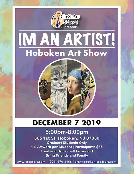 Cre8sart students are invited to showcase their artwork at our "I'm An Artist" Art Show at the Cre8sart School in Hoboken. The reception will be on 12/07/19. Bring your friends and family.